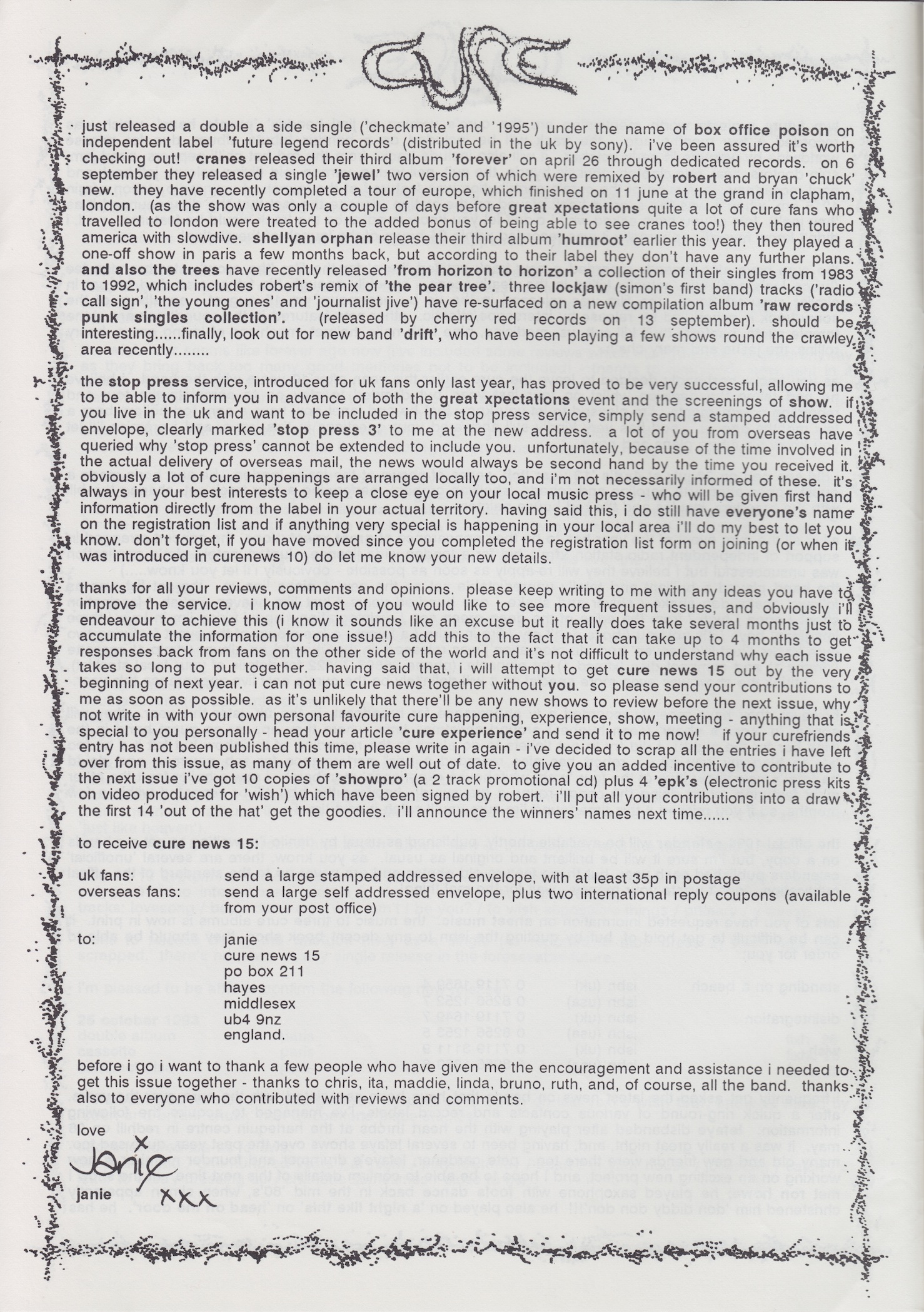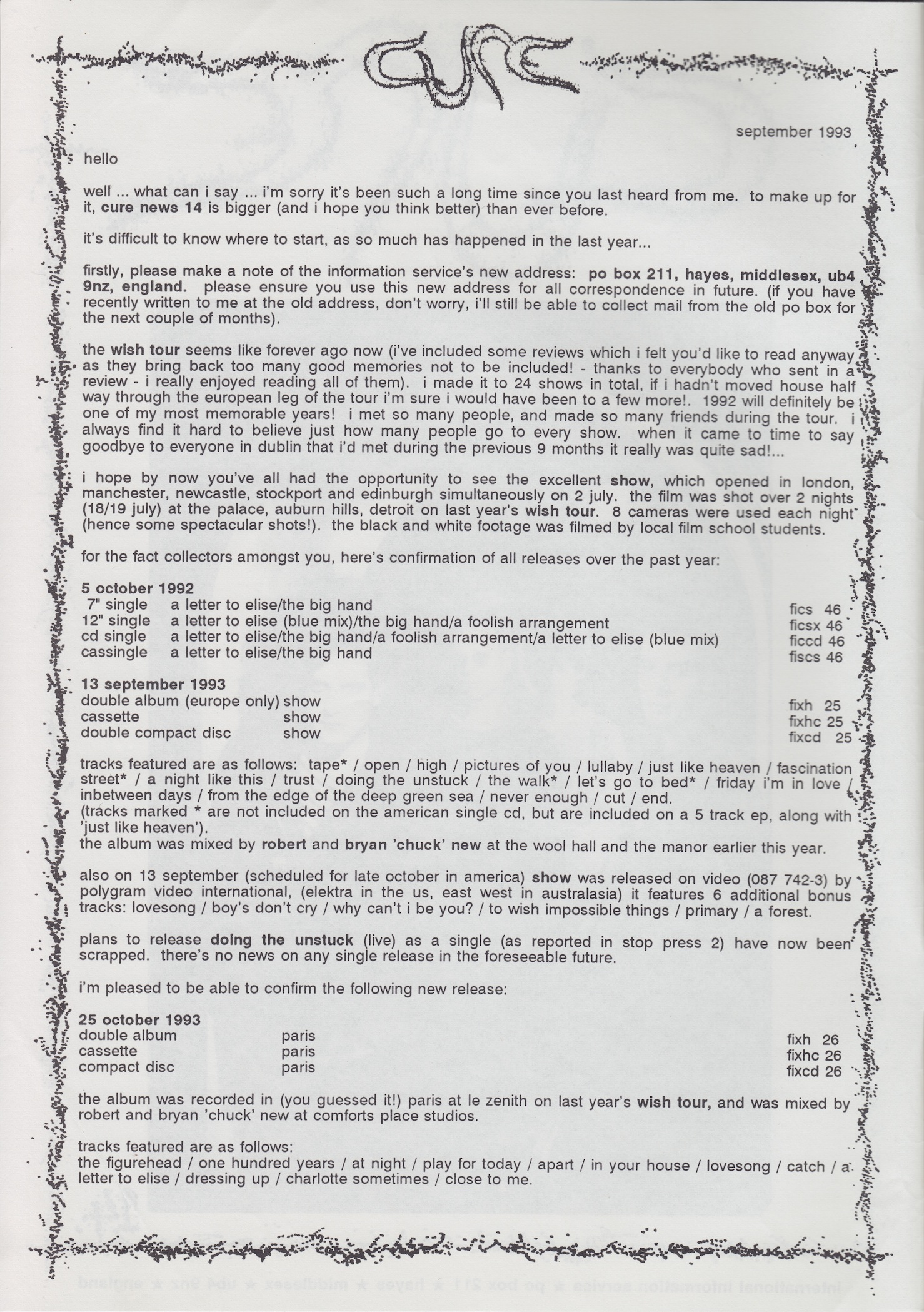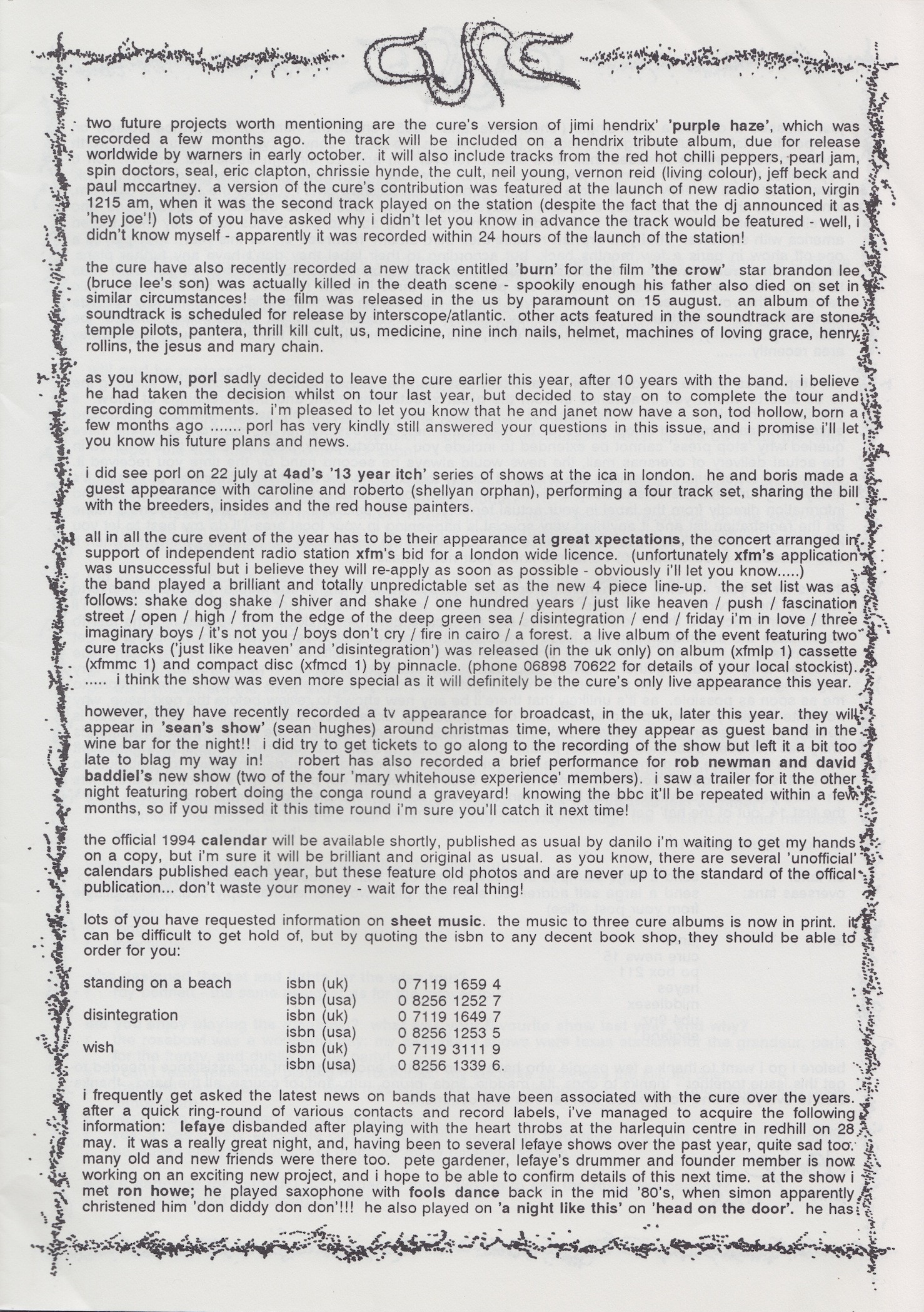 Cure News (UK) n° 14 1. 9. 1993 petr.halla FANZINES, FANZINES (1993), FANZINES (UK), OFFICIAL PUBLICATIONS 0 INFO Official fanzine. Issue n° 14 includes news, questions & answers, inspirations to Disintegration and Wish albums, Wish Tour reviews and more. SCANS FANZINES 1993
