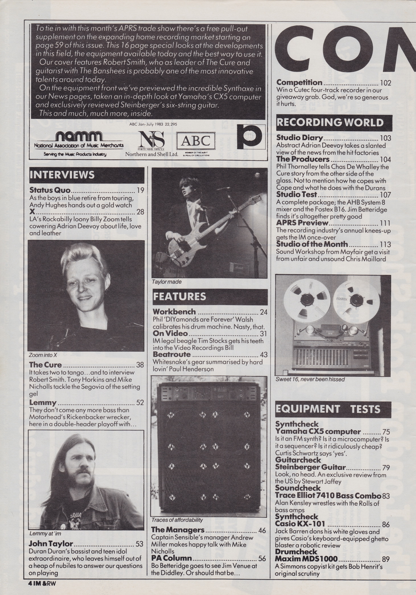 International Musician (UK) Vol. 10 n° 6 1. 6. 1984 petr.halla PRESS, PRESS (1984), PRESS (UK) 0 INFO Interview with Robert Smith entitled "Top Cat" written by Mike Nicholls and Tony Horkins. Also there is interview with Phil Thornalley written by Chas de Whalley. SCANS INTERNATIONAL MUSICIAN MAGAZINE (UK)PRESS 1984