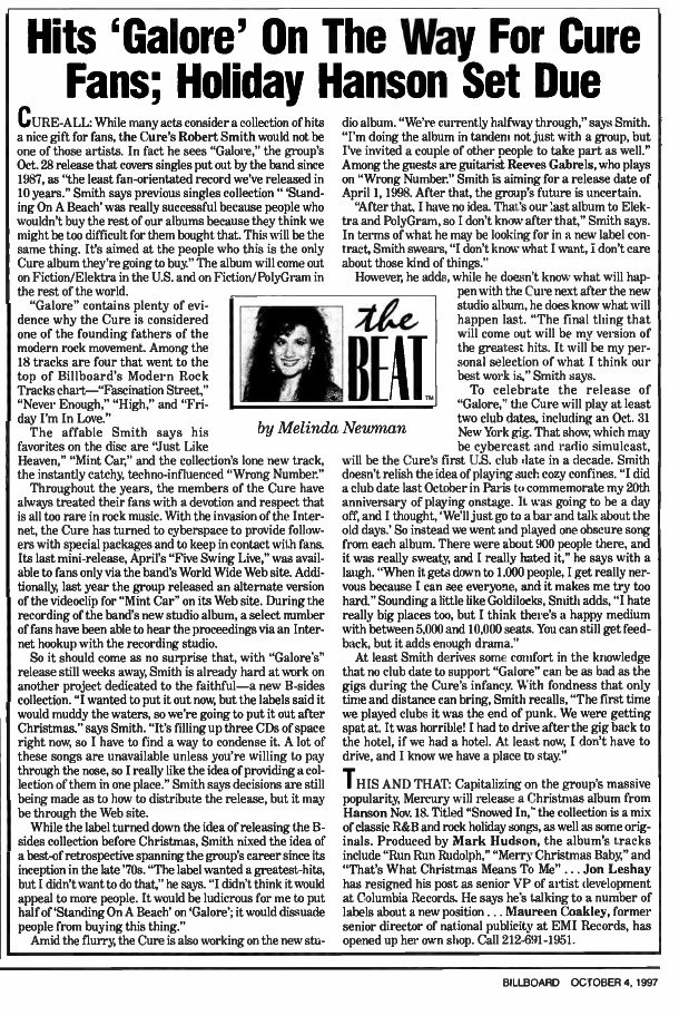 Article entitled "Hits Galore On The Way For Cure Fans, Holiday Hanson Set Due" written by Melinda Newman.