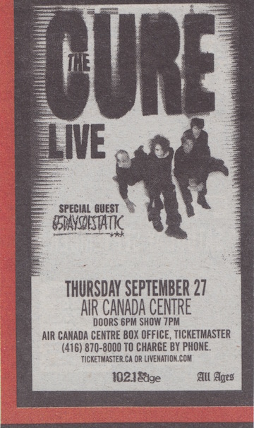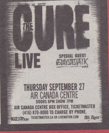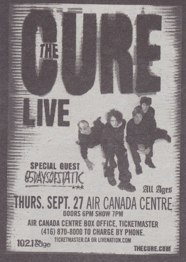 Toronto, Air Canada Centre (USA) 27. 9. 2007 petr.halla CONCERTS, LIVE (2007) 0 INFO Cancelled and postponed to 15 May 2008. LINE-UP Robert Smith, Simon Gallup, Jason Cooper, Porl Thompson SUPPORT ACT 65daysofstatic MEMORABILIA Tour advert. Adverts. VENUE Air Canada Centre 40 Bay Street Toronto, ON M5J 2X2 Canada LIVE 2007