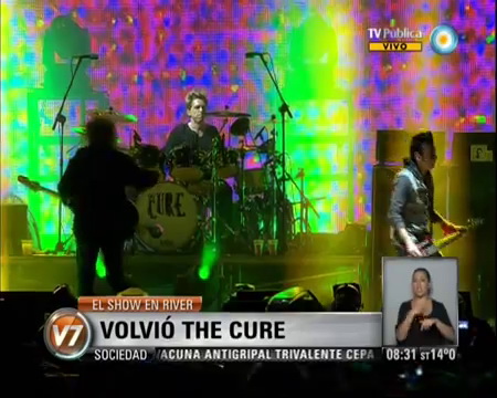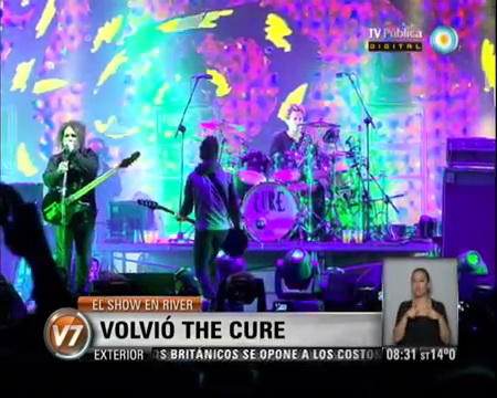 Vision 7 (TV) 15. 4. 2013 petr.halla TV & FM, TV & FM (2013) 0 INFO News report entitled "Volvio The Cure" from the show in Buenos Aires with live extract of Lullaby. 1 min VIDEOSTILLS VIDEO BROADCAST HISTORY 15.04.2013 - Television Publica | Canal 7 (Argentina) @ 08:30 ART TV & FM 2013
